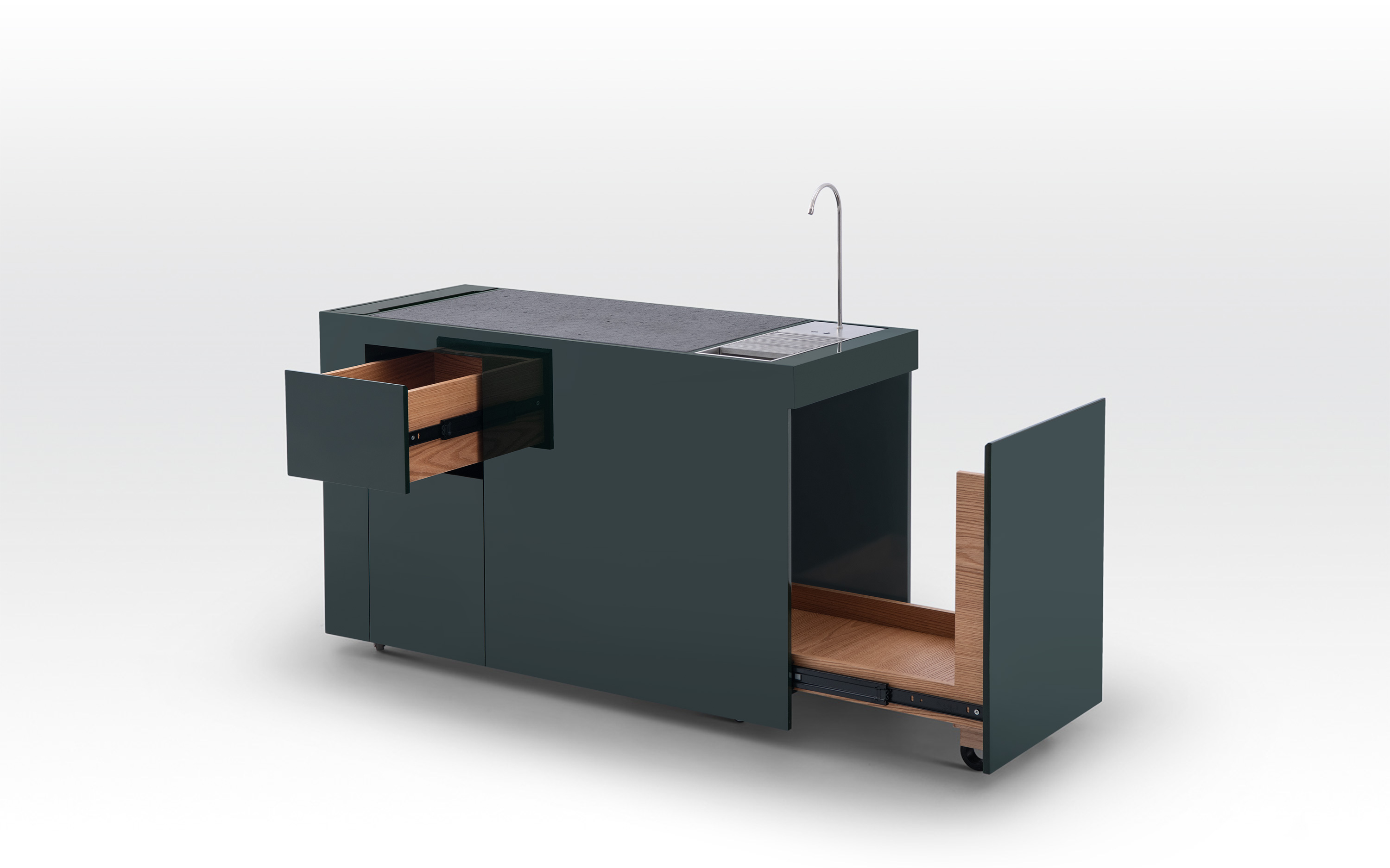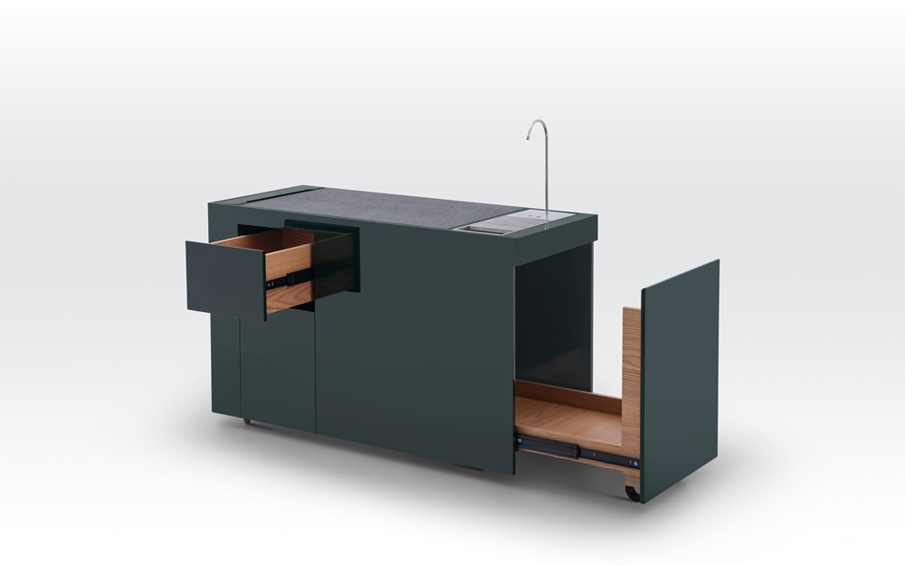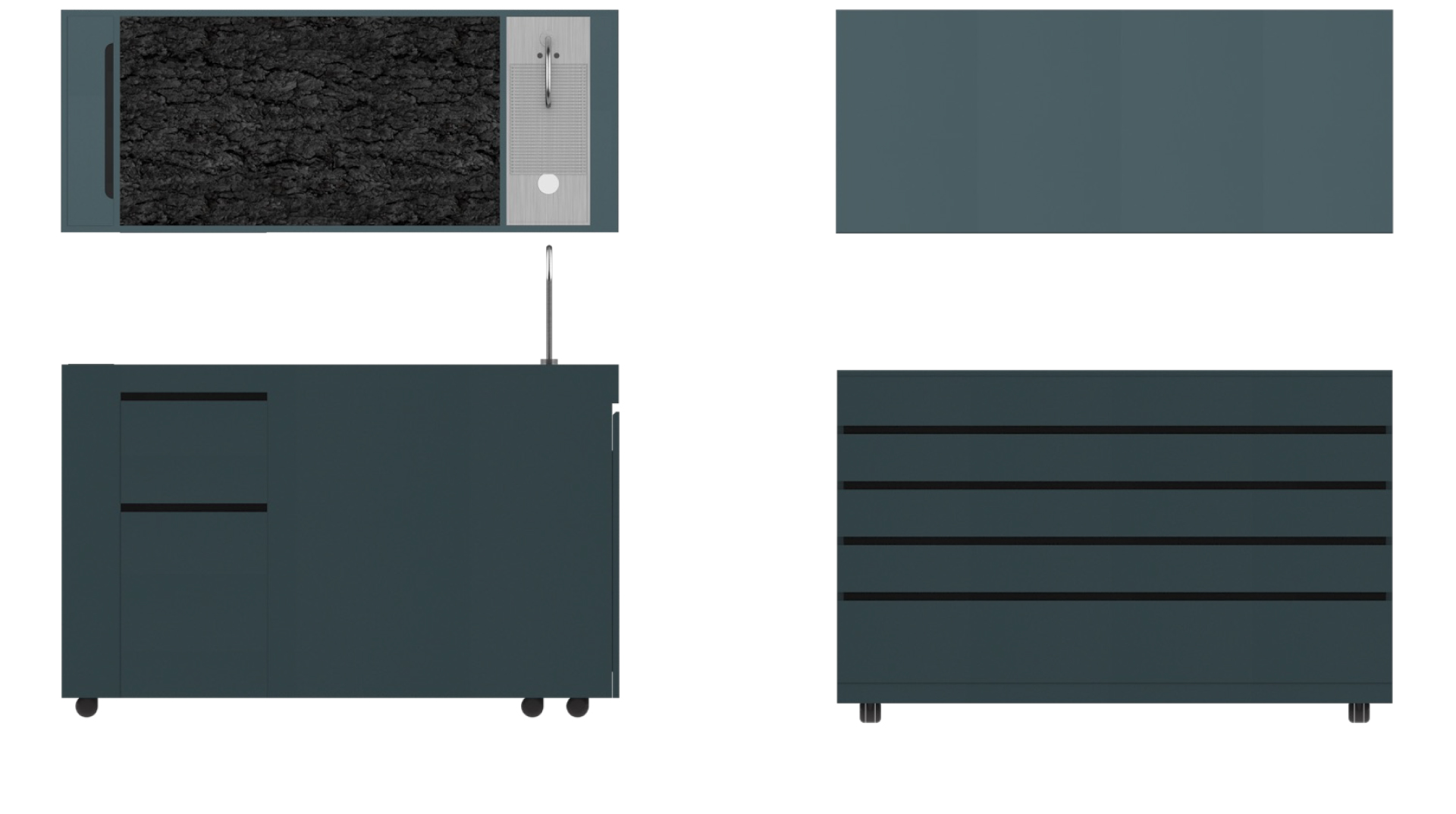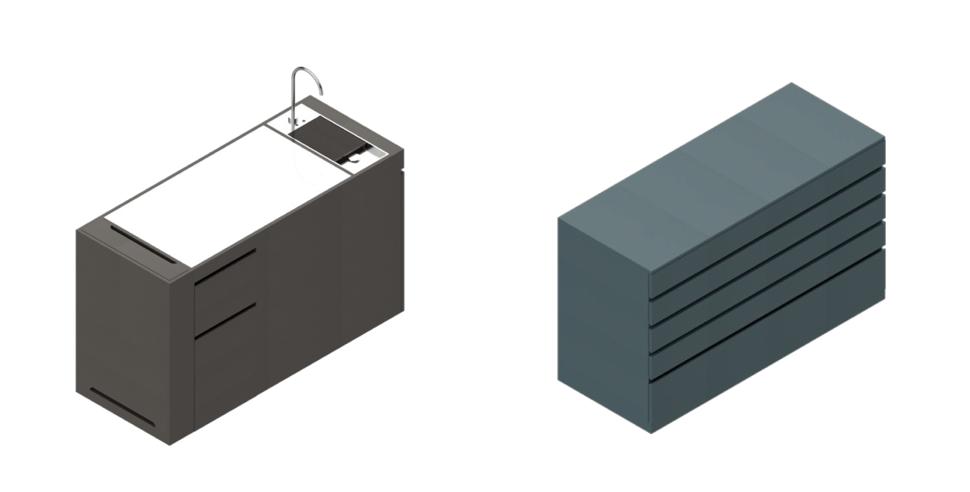 一つは引き出しだけのシンプルな機能なのだが、もう一つは給水タンクと排水タンクを備えていて、様々な用途に用いることができる。また、電源が準備されていて、電気器具を用いることもできる。