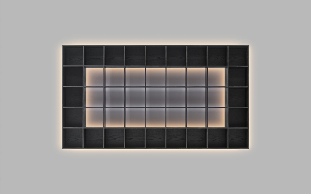 木製のグリッドの棚は棚なのだが同時に影を演出する照明具でもある。色々なものを展示して室内を演出する。